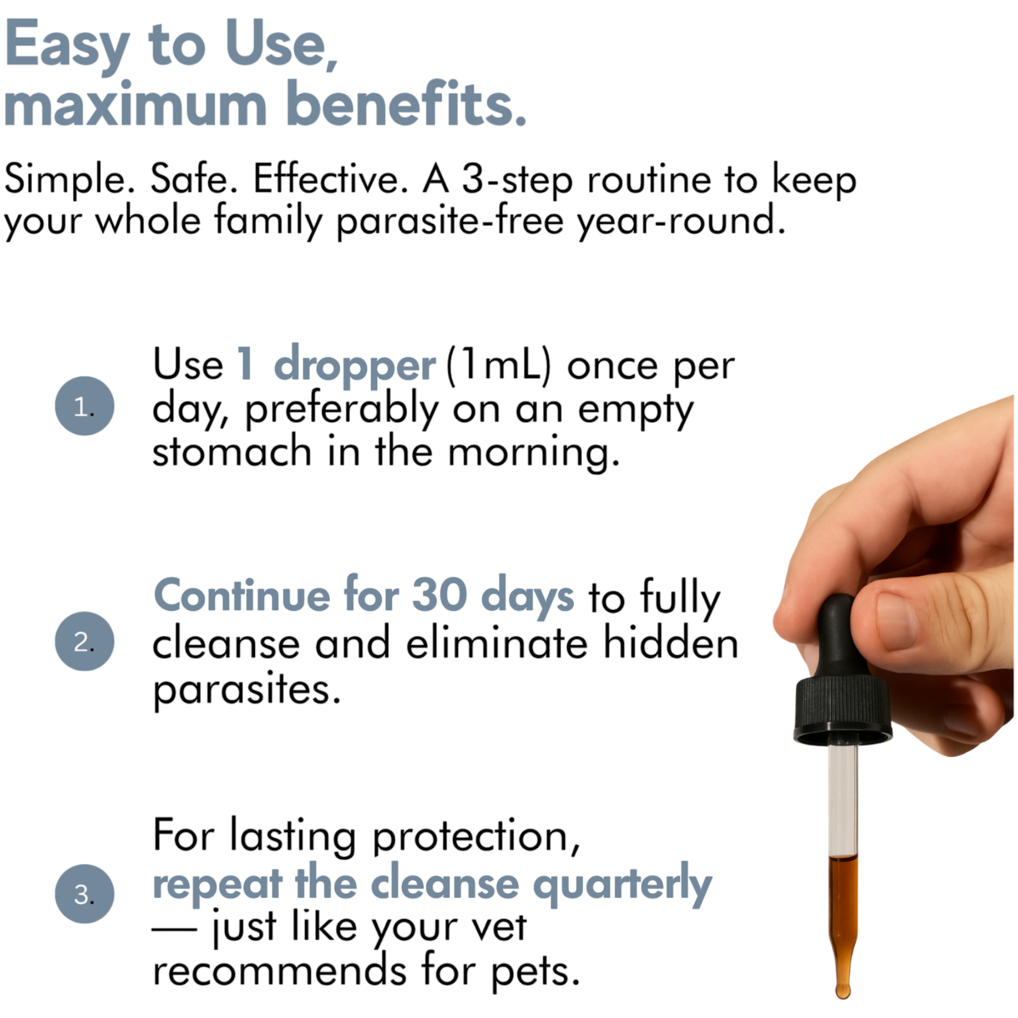 Your vet deworms pets every 3 months because parasites are constant. Apply the same proven protocol to your family - regular, preventative protection.
